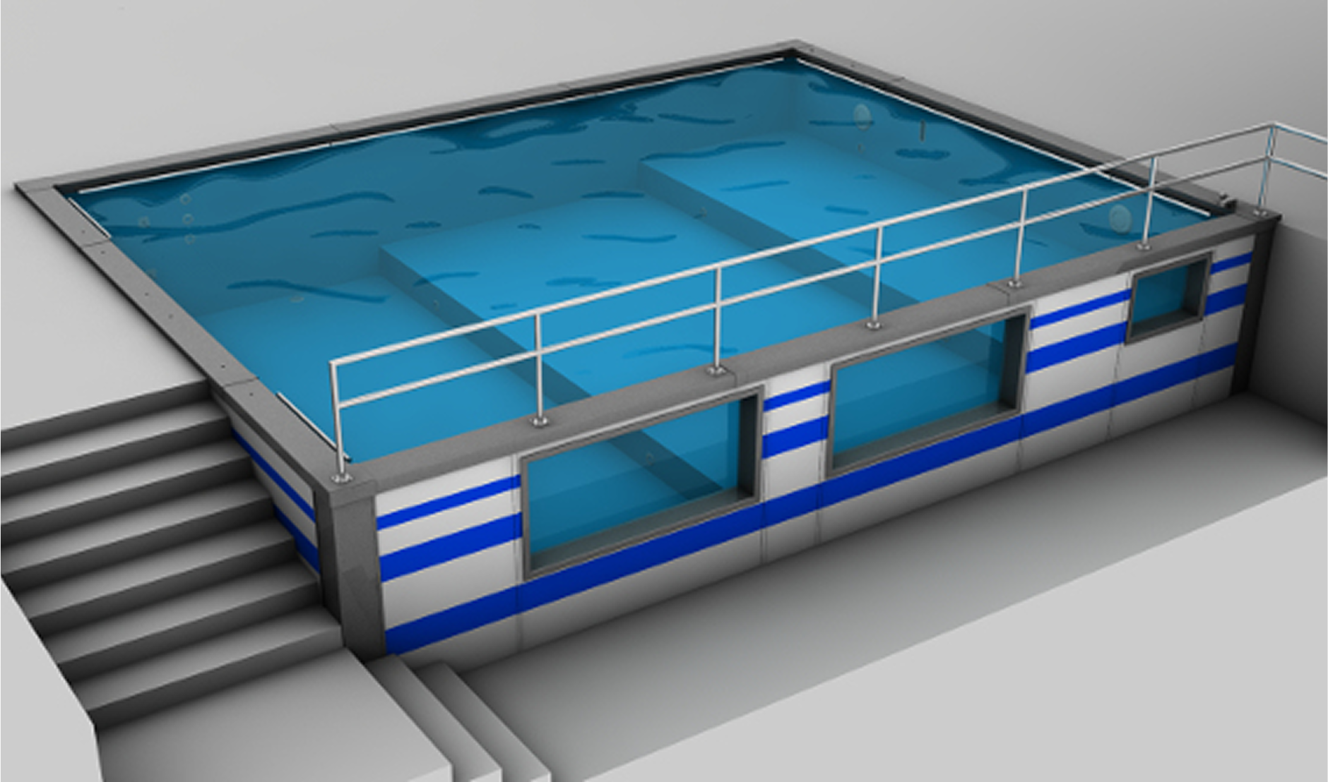 6×8 (m) modular pool with 3 differents depths equipped with observation windows, colored lighting, counter current and ceiling hoist. Located at the University Malaya Medical Centre (UMMC/PPUM) in Kuala Lumpur (Malaysia).